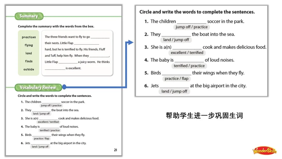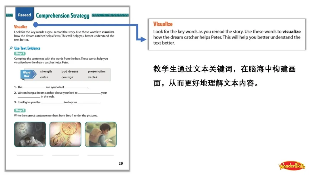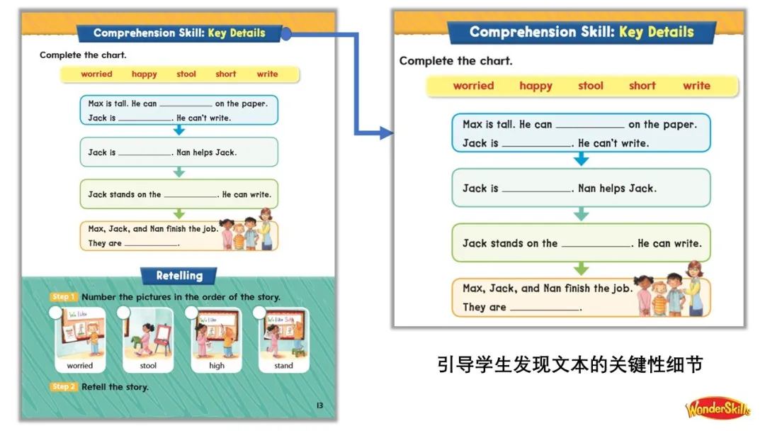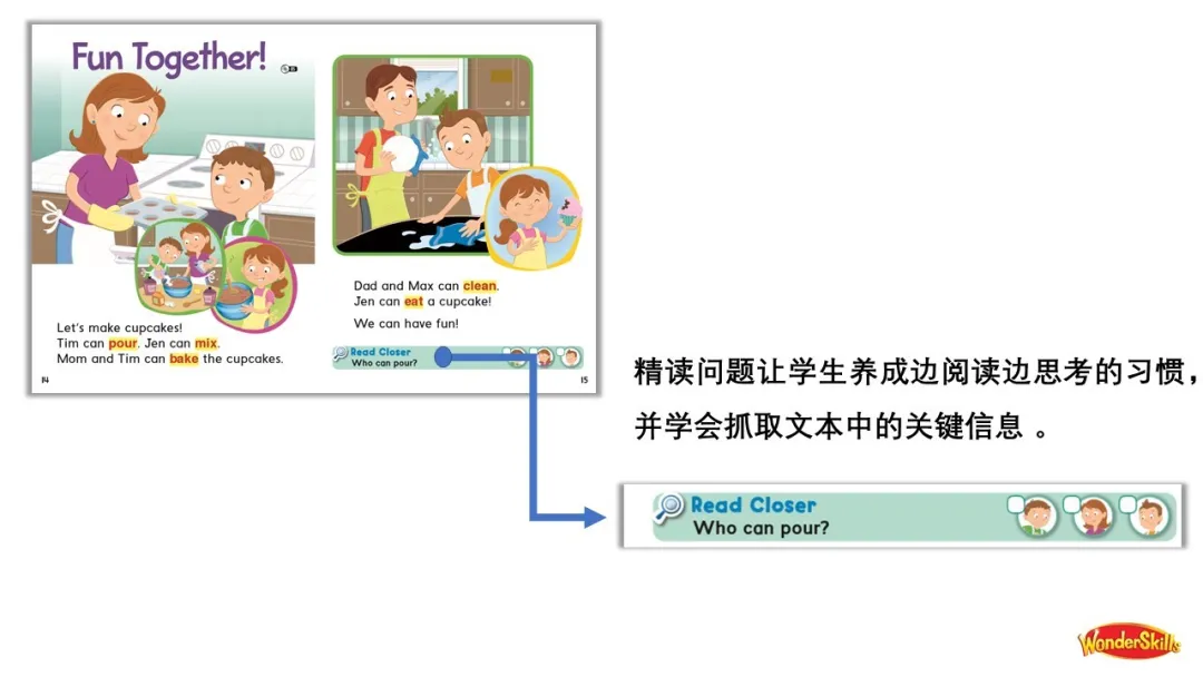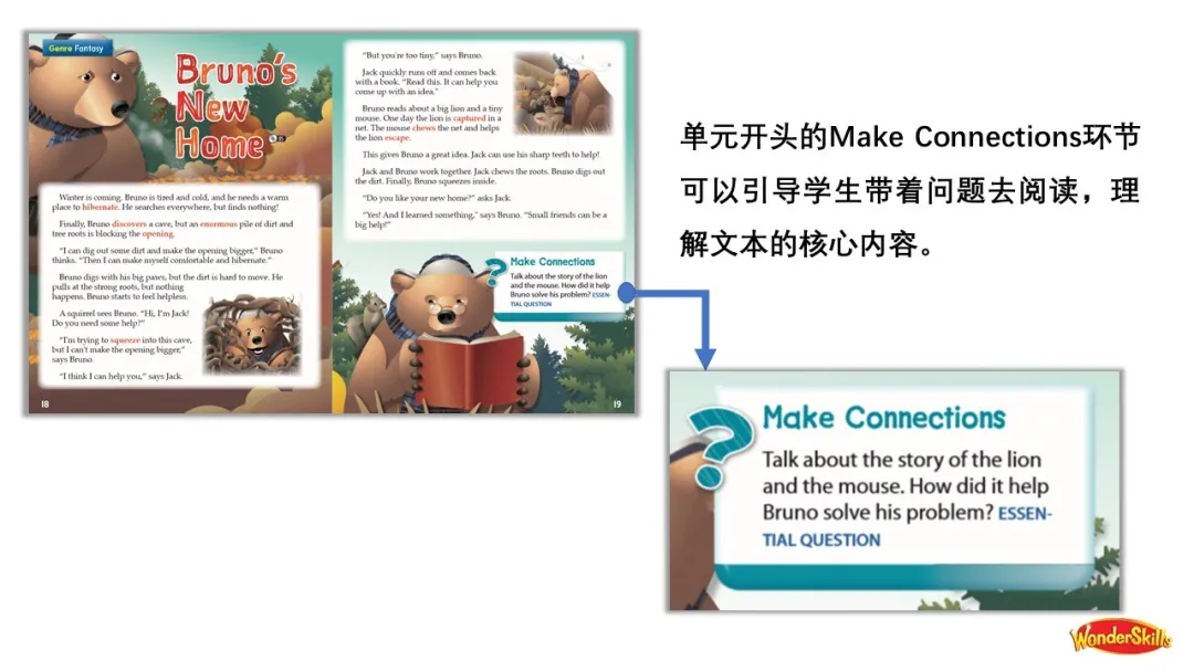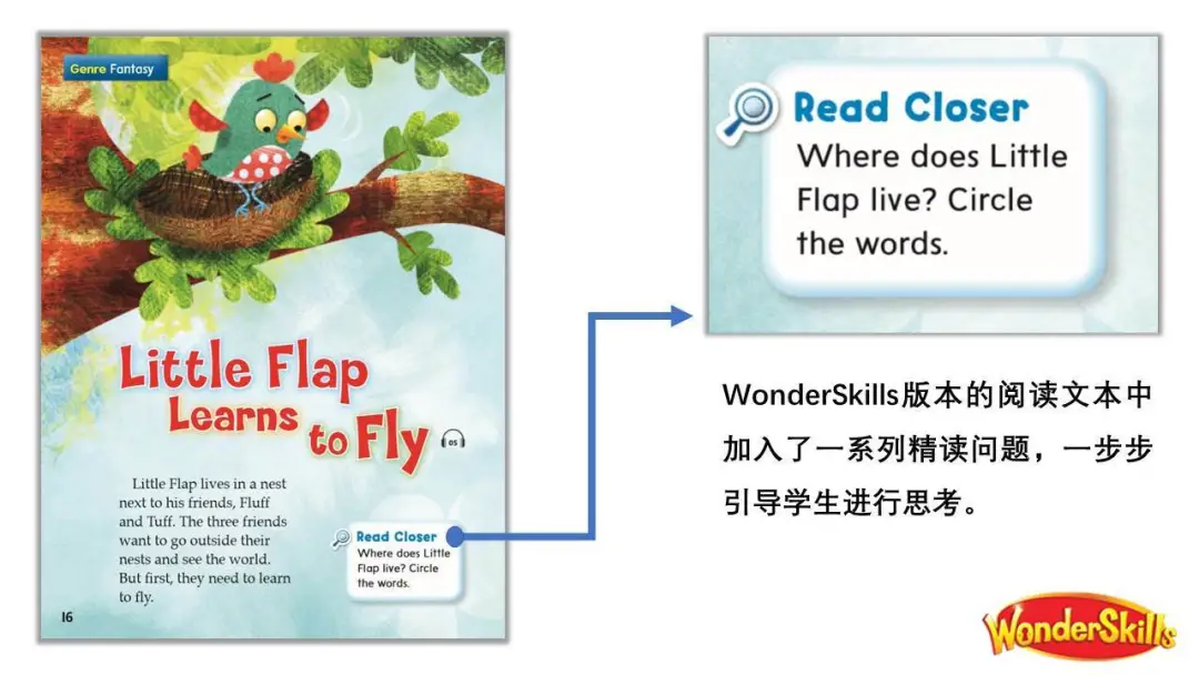 在保证优质文学阅读体验的前提下,WonderSkills将Wonders中的文本进行了改编:缩短文本长度,降低词汇难度,加上引导性的精读问题,使教学重点更为集中、教学过程更加轻松。